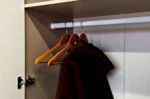 Шкаф имеет удобное наполнение: слева расположены полки для хранения вещей, а справа - штанга для вешалок. Это позволяет рационально использовать пространство и разместить различные типы одежды.