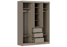 Сочетание распашных дверей и раздвижных створок позволяет эффективно использовать пространство в комнате. Центральная часть оснащена тремя выдвижными ящиками — идеально для хранения мелких предметов.